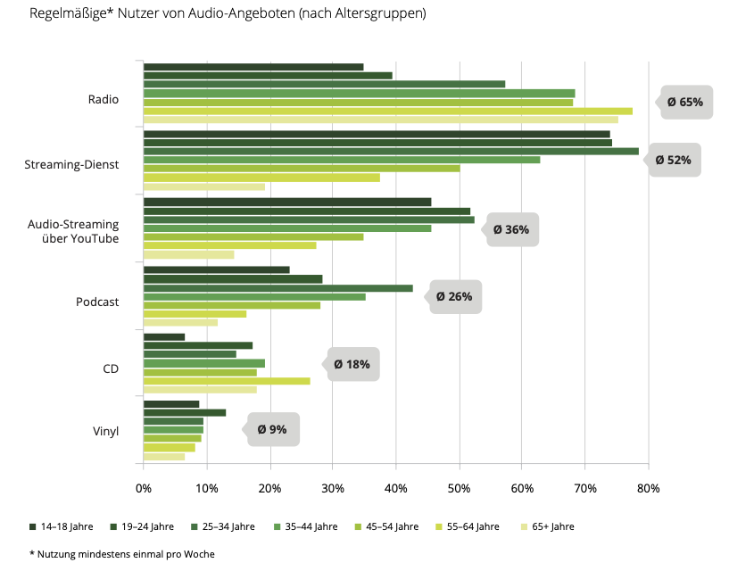Im Audio-Sektor behauptet sich das Radio als reichweitenstärkster Kanal, steht aber unter Druck durch wachsende Podcast-Konkurrenz.