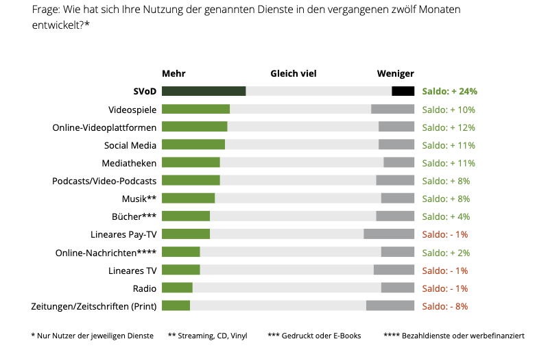 Nutzungssieger: SVoD verzeichnet mit einem Saldo von +24 % den höchsten Zuwachs bei der Nutzungsdauer.